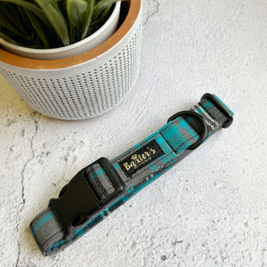 The teal blue and grey tartan collar is super stylish. With a light grey base and tartan pattern of dark grey, teal blue and black running through it screams high end chic. Tartan is a traditional fabric brought bang up to date with the modern colour pallet.