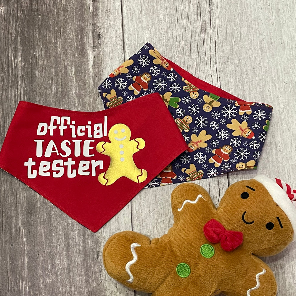 The front fabric features our exclusive hand drawn gingerbread design - lots of gingerbread men and women in festive outfits! The reverse has a hand applied vinyl design “Official Taste Tester”, using metallic vinyls for extra Holiday cheer. Fully reversible - two Christmas designs in one bandana!