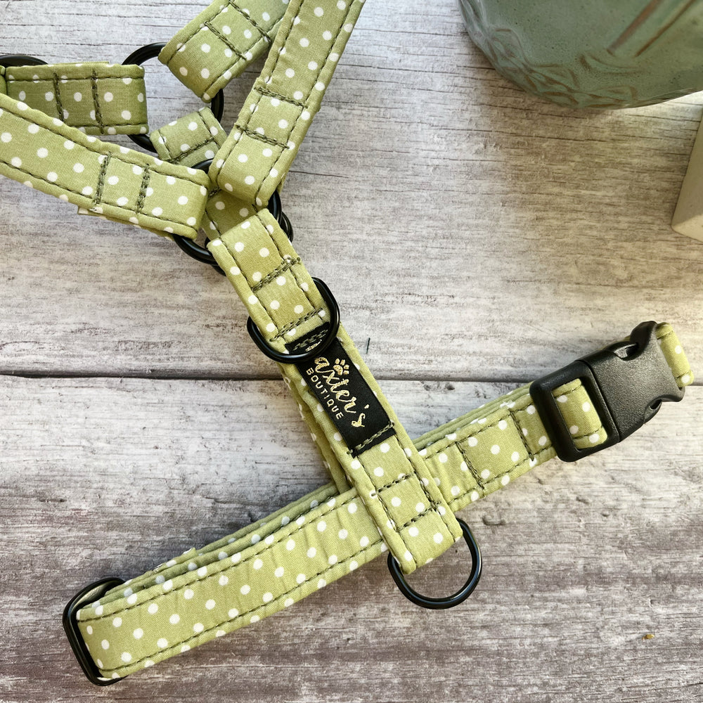 A pretty cool toned pistachio covered in tiny white polka dots. Matching accessories available.